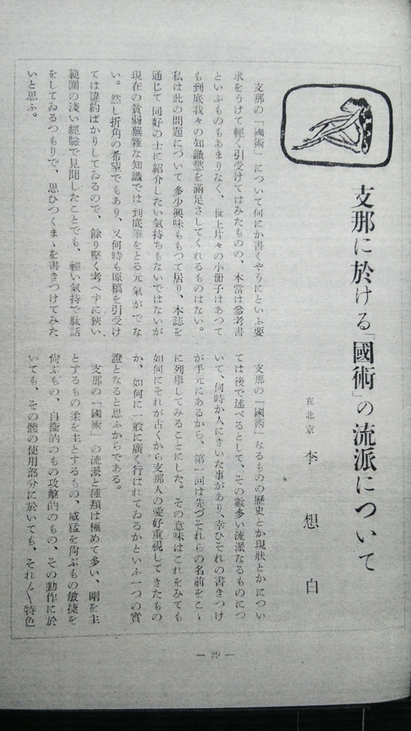 1.支那に於ける「國術」の流派に就て / 李想白(大日本体育会『体育日本』1940年5月)