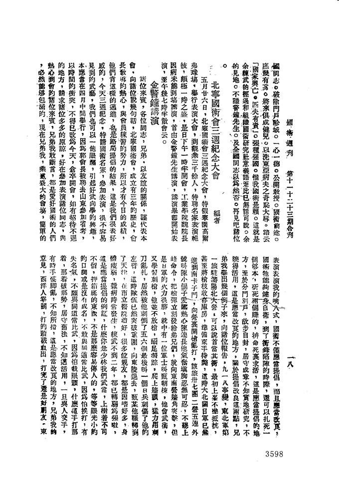 「国術週刊」の「第十一十二十三合刊」(注)に、天津の北寧国術会設立三周年についての記載がある。